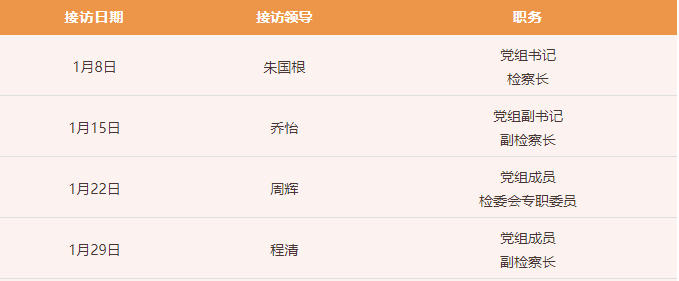 为深入贯彻习近平法治思想,践行新时代检察机关以人民为中心的发展思想,进一步密切检察机关同人民群众的联系,提升12309检察服务中心服务质效,扎实做好检察长接访工作,推动案结事了人和,我院坚持开展12309检察服务中心“检察长接访日”活动,现将本院“检察长接访日”1月接访安排公告如下: