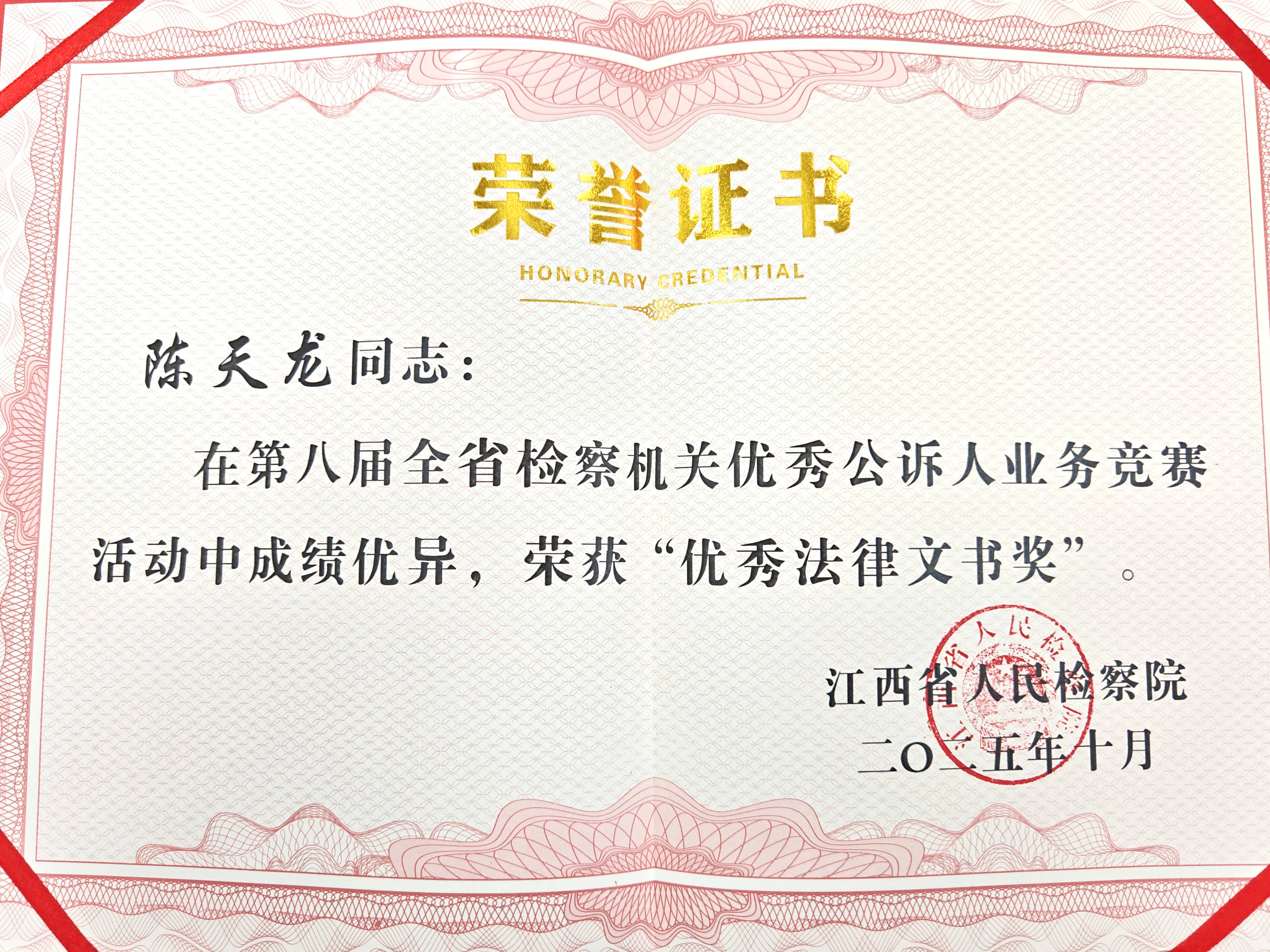 我院第一检察部副主任、员额检察官陈天龙在高强度的比拼中披荆斩棘、奋勇争先,荣获“全省公诉能手”和“优秀法律文书奖”!